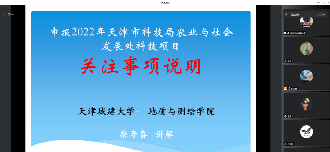 为进一步做好2022年度天津市社会发展与农业领域科技项目申报工作,6月14日,我校通过线上会议方式举行2022年天津市社会发展与农业领域科技项目辅导及申报工作推动会。本次会议邀请我校地质与测绘学院柴寿喜教授做项目辅导讲座,我校教师共计50余人参会。
