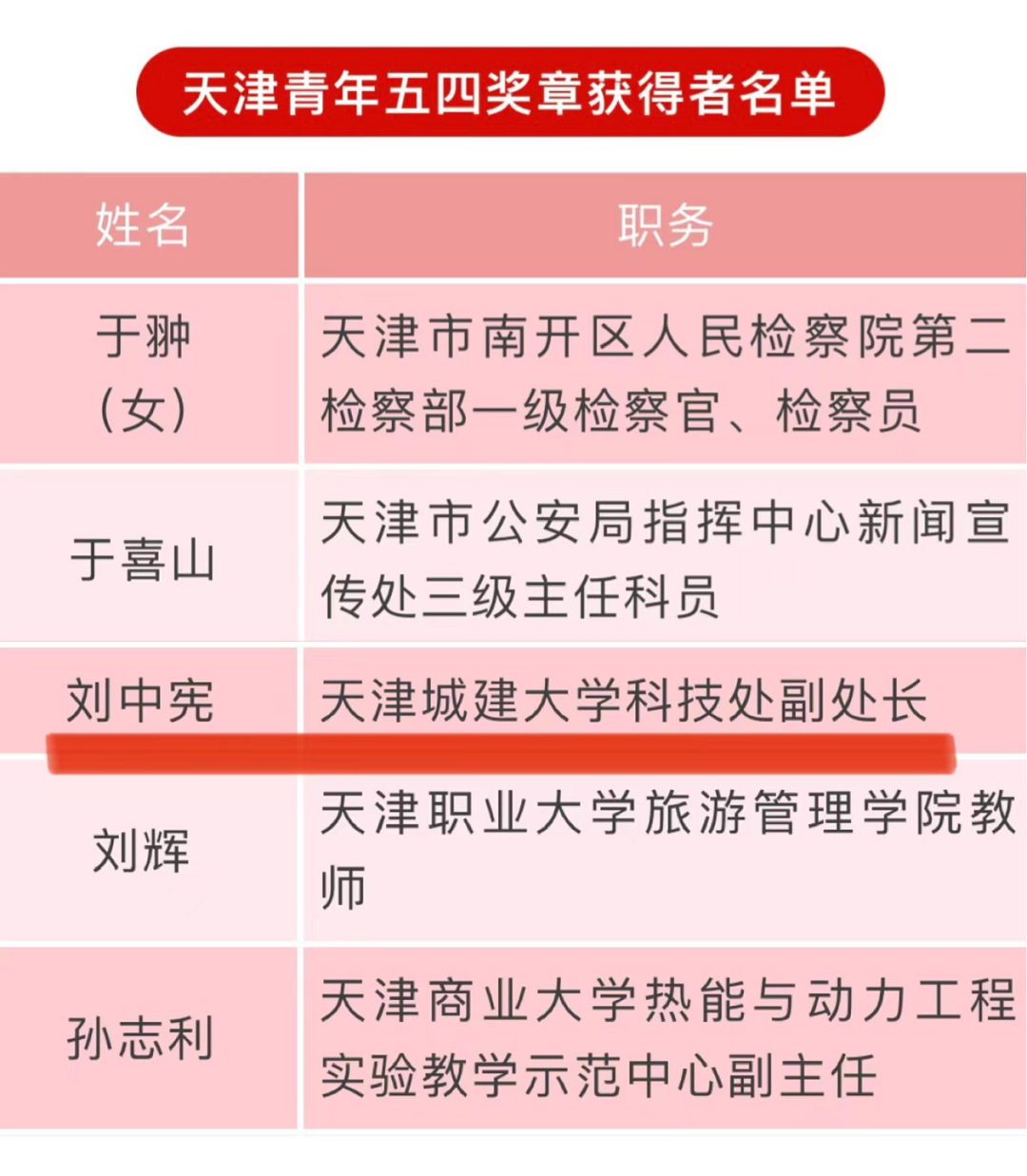 在五四青年节来临之际,“天津青年五四奖章”评选结果揭晓,我校科技处副处长刘中宪荣获“天津青年五四奖章”荣誉称号。