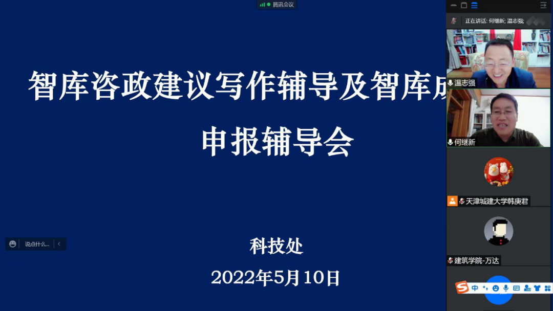 5月10日,为进一步提升我校教师咨政建议的写作能力,提高我校智库成果奖申报质量,我校通过线上会议方式举行咨政建议写作及智库成果奖申报辅导会,会议邀请天津市特聘教授,天津师范大学政治与行政学院教授、博士生导师,国家治理研究院副院长温志强教授作题为“破‘五唯’背景下智库研究如何实现三个‘影响力’”专题讲座。讲座由科技处处长何继新主持。学校各学院科研负责人、智库负责人和教师150余人参会。