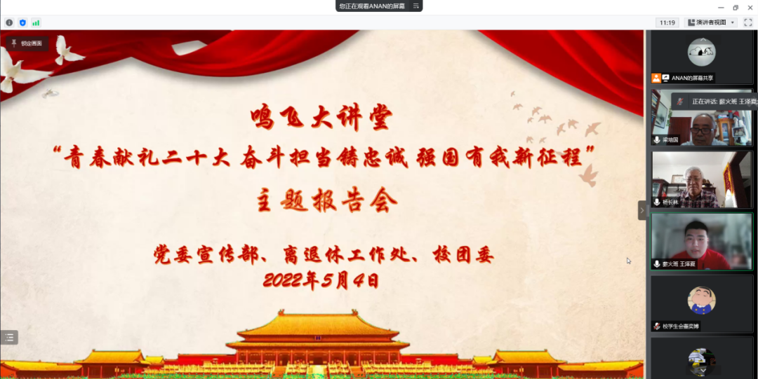 5月4日中午,校关工委、校团委联合天津市军休干部系统关心下一代工作委员会,共同举办“青春献礼二十大 奋斗担当铸忠诚 强国有我新征程”线上主题报告会。