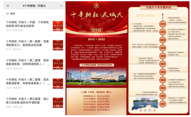 学校大力营造学习宣传贯彻党的二十大精神的浓厚氛围,学校微信公众号以及校院两级媒体精心设计,开设“喜迎二十大”“聚焦党的二十大”等栏目,引导全校师生党员干部全方位、多层次对党的二十大精神深入学习,进一步扩大党的二十大精神宣传广度,截止目前共发布相关新闻报道100条。其中,“振奋人心!我校广大党员干部师生热议中国共产党第二十次全国代表大会开幕”“踔厉奋发 勇毅前行!我校党员干部热议党的二十大报告”“马克思主义学院教师收听观看党的二十大开幕会掀起热烈反响”“鼓舞人心,催人奋进!我校辅导员热议党的二十大”“青春逢盛会,奋斗正当时!我校学生热议党的二十大开幕盛况”“党的二十大胜利闭幕,我校师生热议闭幕会”等热议和反响情况,覆盖全校干部党员师生,使宣传效果迅速升温加力。开辟的“十年耕耘 天城大”特别报道,目前已围绕党建引领、铸魂育人、五育并举、师德师风、高教创新、国际交流与合作、教育扶贫、回顾展望等8个选题,分阶段、全面系统、重点突出地展示党的十八大以来学校发展取得的新业绩新成果。学校迎庆党的二十大相关新闻被人民网客户端、中国教育新闻网、天津日报、津云、津门教育等媒体报道13篇次,充分反映全校上下学习宣传贯彻党的二十大精神的实际行动和显著成效。