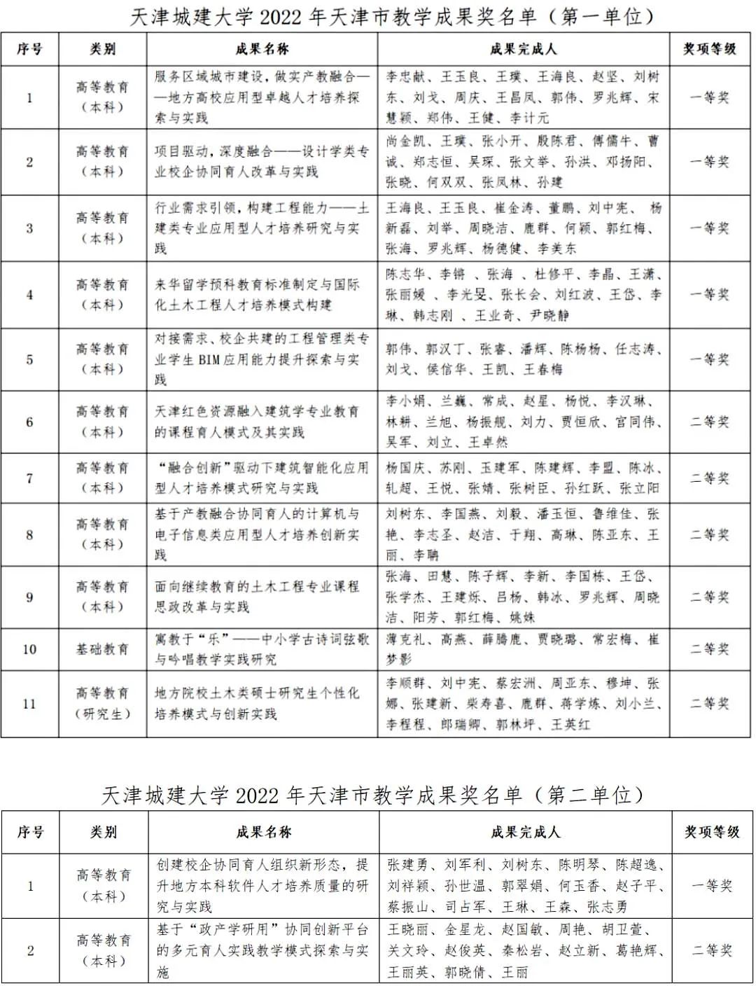 近日,天津市教育委员会公布2022年天津市教学成果奖名单,我校13项成果获奖。其中,我校作为第一单位获评的有11项,分别为高等教育(本科)一等奖5项、二等奖4项,高等教育(研究生)二等奖1项,基础教育二等奖1项;我校作为第二单位获评的有2项,分别为高等教育(本科)一等奖1项、二等奖1项。此次获奖是我校继2018年获评8项天津市教学成果奖以来在获奖种类、等级及数量上的又一次突破。
