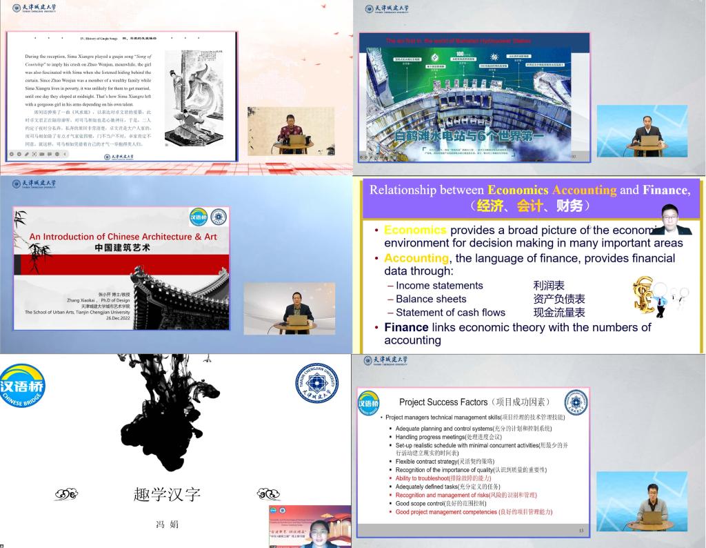 学校深入学习贯彻习近平主席复信沙特中文学习者代表讲话精神,依托校内优质教育资源,将汉语学习与专业技能培养紧密结合,着力打造“中文+建筑工程”“中文+工程管理”等特色中文课程,先后开设了《琴歌艺术-中国传统文化的优秀代表》《地下空间开发发展现状与安全建造关键技术》《中国工程建筑发展成就》《中国建筑艺术》等10余门具有浓厚城建特色的“中文+”课程。通过线上语言直播课、文化录播课等多种形式为学员们展示了一场场丰富多彩的文化盛宴,使学员们深刻感受独特的中国古现代建筑之美,领略中华文化魅力。