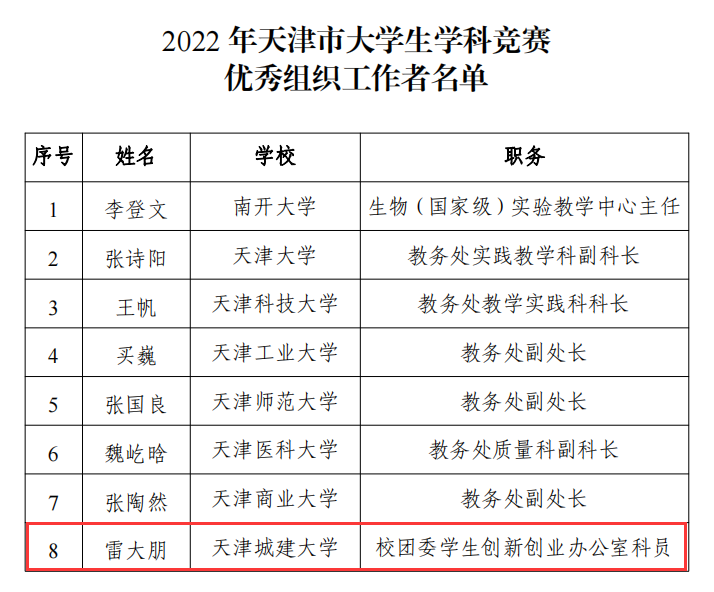 日前,市教委公布了2022年度天津市大学生学科竞赛获奖名单。我校荣获“2022年天津市大学生学科竞赛优秀组织单位”,校团委教师雷大朋荣获“优秀组织工作者”荣誉称号。