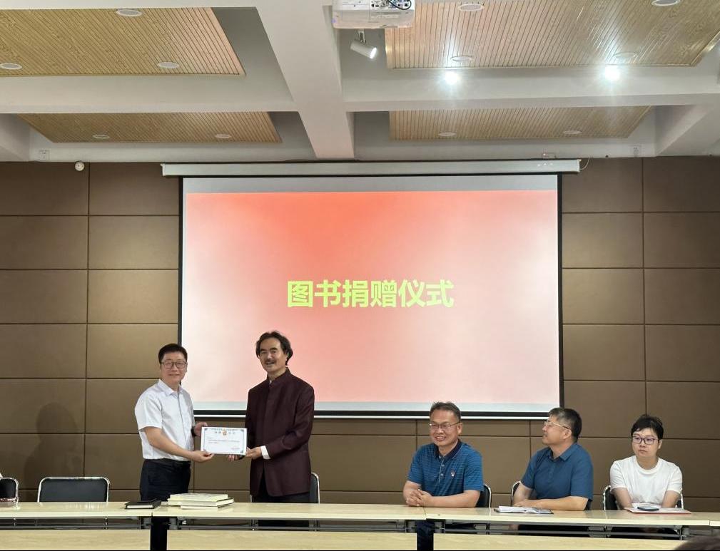 杨教授任教几十载,在教书育人的同时,也翻译了数十部外文书籍,在自己热爱的事业中发光发热,并将曾翻译过的多部外文书籍捐赠给学院,以此作为坚实基础汇入学院的发展历程。汪江华为杨教授送上捐赠证书,并代表学院向杨教授的无私奉献表示感谢。教师代表杨永娟为杨教授送上献花,表达全体教师对杨教授的祝福与不舍。