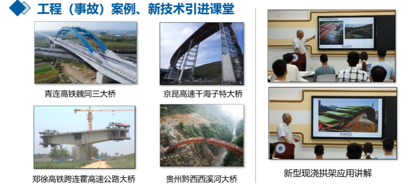 课程内容秉持追踪行业动态,根据行业发展适时更新,主要体现在注重收集桥梁施工、运营过程事故案例,并将其纳入课堂教学,将教师参与社会服务掌握新技术及时反馈教学。