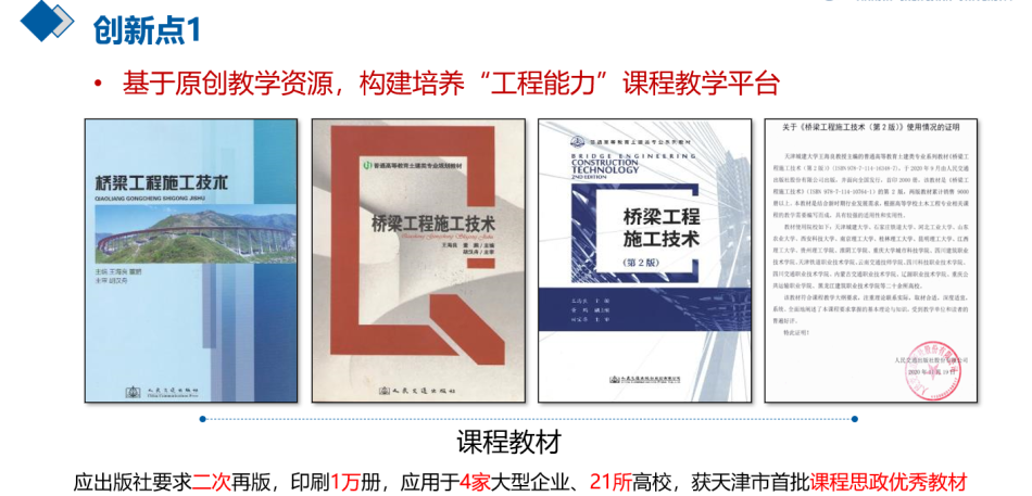 教材采用课程组编写的《桥梁工程施工技术》教材自2013年出版至今,已两次再版、五次印刷,销售达万册;出版了《桥梁工程施工临时结构设计及案例分析》《MIDAS/Civil在桥梁施工结构分析中的应用》课程扩展教材;构建了课程网络教学系统;依托国家精品课程资源开展线上线下结合教学;课程教材及人才培养方法被石家庄铁道大学、南京理工大学等21所高校、中国铁建大桥局等4家大型国有施工企业采用,涵盖全国10个省、市、自治区。
