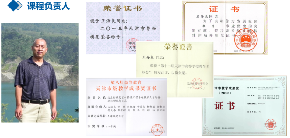 课程负责人王海良教授:土木工程学院院长,享受国务院特殊津贴专家、天津市教学名师,住建部《高等学校土木工程专业课程教材与教学资源委员会》专家组成员;作为主持人获天津市教学成果一等奖、二等奖;课程建设教改项目结题获天津市优秀;主编教材获天津市首批课程思政优秀教材。