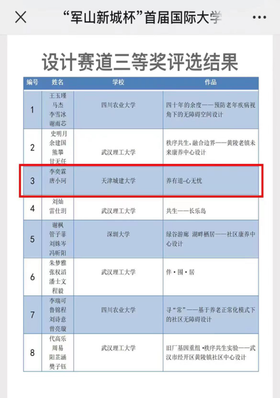 近日,“军山新城杯”首届国际大学生绿色智慧城市设计大赛颁奖仪式在武汉理工大学举行。我校建筑学院2020级城乡规划专业学生李奕霖、唐小珂的作品“养有道,心无忌——基于智慧城市背景下的无障碍康养社区设计”在本届竞赛中获得设计赛道三等奖及奖金1万元。