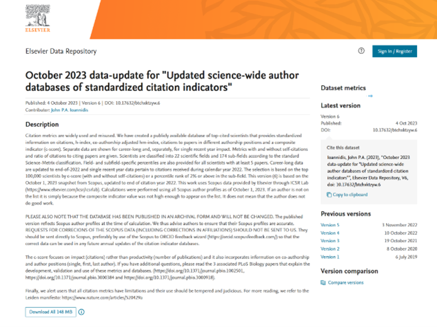 据悉,全球所有学科前2%顶尖科学家榜单是斯坦福大学John P. A. Ioannidis教授团队与Elsevier合作的项目成果,该榜单分为“学术生涯科学影响力排行榜”和“年度科学影响力排行榜”,是从近700万名科学家中遴选出世界排名前2%的科学家。该榜单于2019年7月首次发布,榜单基于Scopus数据库的引用数据系统分析,以被引数(区分自引和他引)、H指数、HM因子等综合指标(composite score,C-score)进行遴选,分为22个领域和174个细分子领域。为科学家科研表现提供了一个衡量指标,能够更客观、更真实地反映科学家的学术生涯期间的综合影响力与上一年的学术影响力。