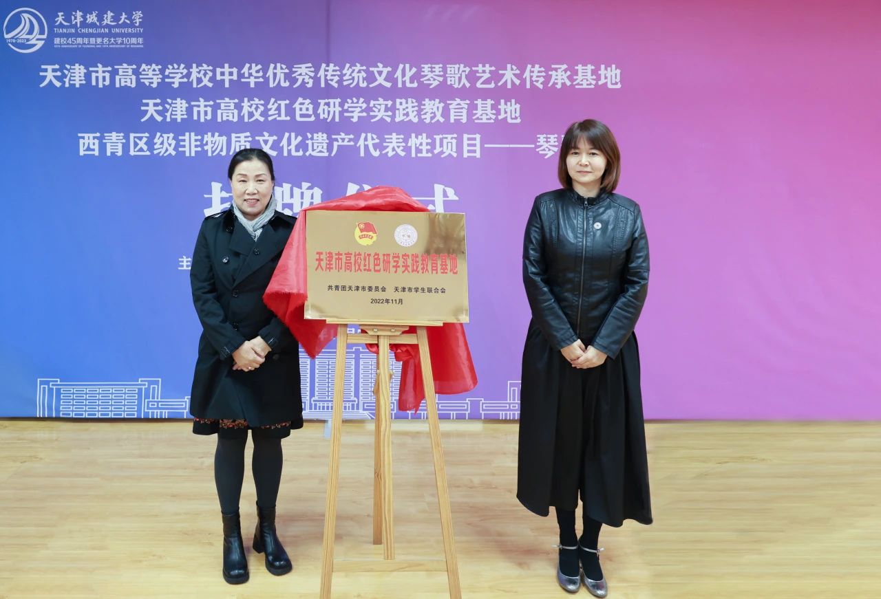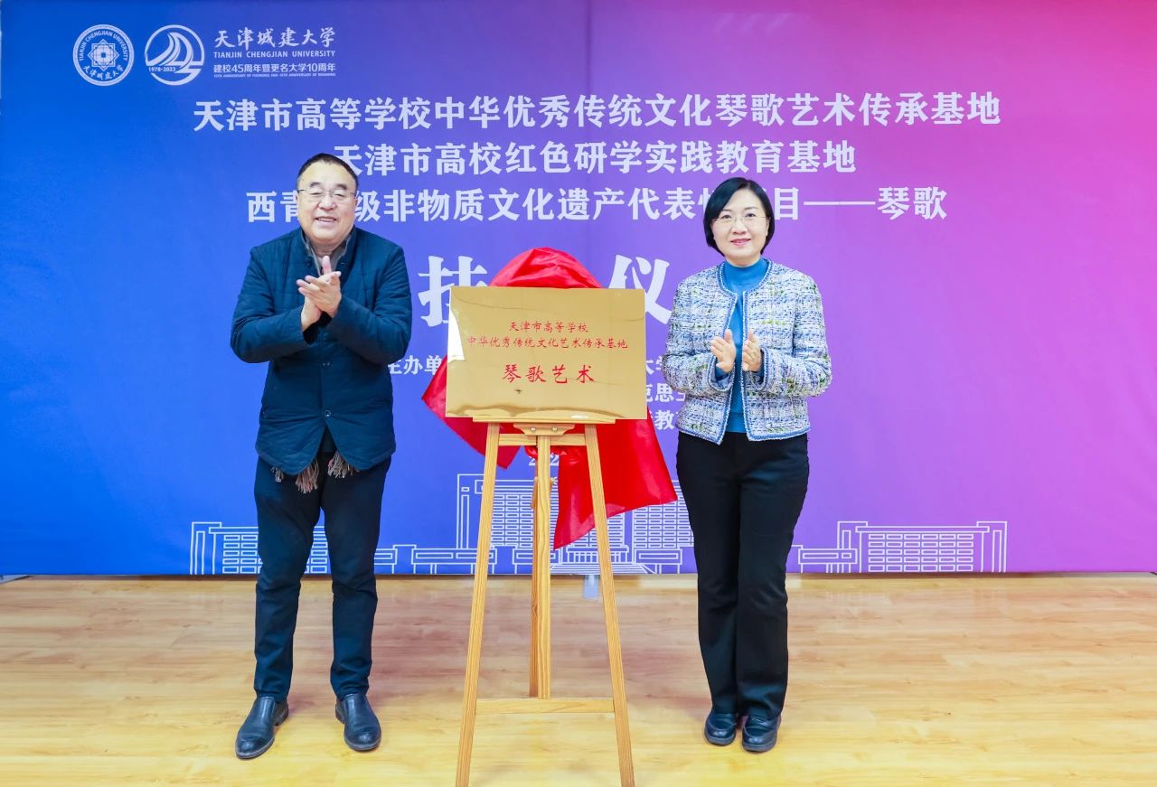 李顺田、马克思主义学院党总支书记高燕为“西青区级非物质文化遗产代表性项目——琴歌”揭牌