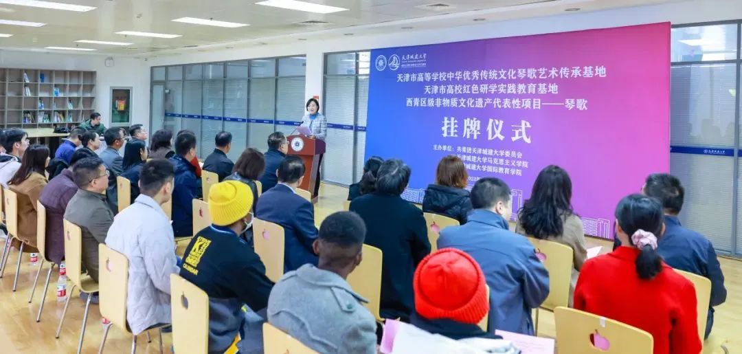 11月7日,我校举办“天津市高等学校中华优秀传统文化琴歌艺术传承基地”“天津市高校红色研学实践教育基地”“西青区级非物质文化遗产代表性项目——琴歌”挂牌仪式。校党委副书记王罡出席仪式,原天津市群众艺术馆馆长、一级作家、编审李治邦,天津市非物质文化遗产保护学会会长、主任记者刘静华,天津西青开放大学副校长李顺田,天津市西青区逸夫小学校长王红受邀参加,我校相关职能部门、教学单位主要负责人、留学生代表,以及天津市滨海新区塘沽紫云中学教师代表等共计40余人参加活动。