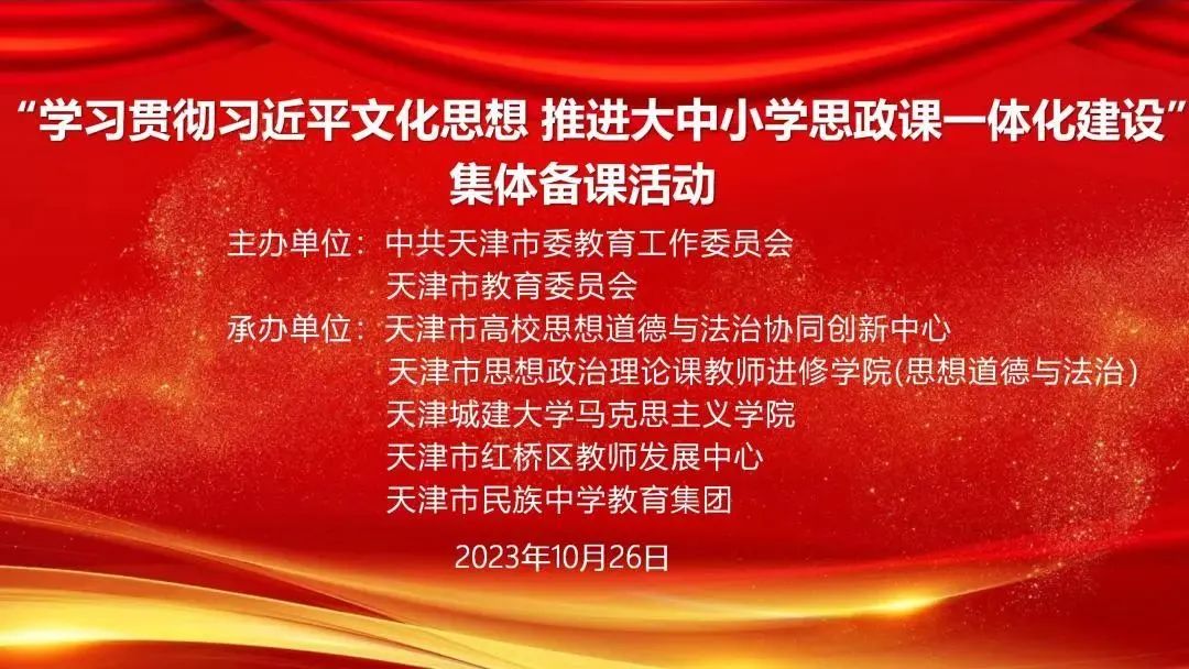 近日,由市教育两委主办,天津市高校思想道德与法治协同中心、天津市思想政治理论课教师进修学院(思想道德与法治)、我校马克思主义学院、天津市红桥区教师发展中心以及天津市民族中学教育集团承办的“学习贯彻习近平文化思想,推进大中小学思政课一体化建设”主题集体备课活动在天津市民族中学举办。70余名来自全市大中小学不同学段的思政课教师代表参加了此次集体备课活动。