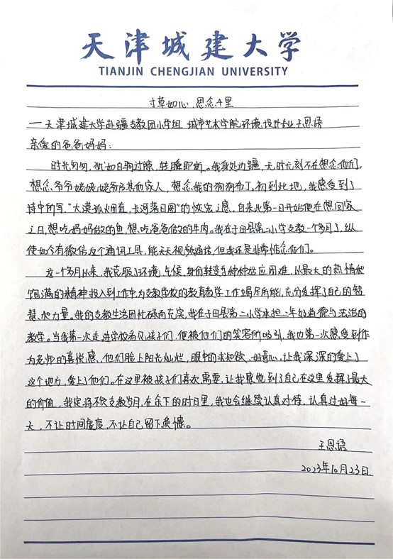 离家赴疆已一月有余,不知你们工作是否繁忙,你们的身体是否安康。支教期间收获良多,特执此信,诉述平安。