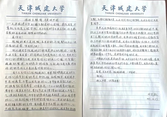 我们一起办了许多活动,也一起走过了和田的许多地方。我们利用20天的课下时间给于田县第二小学的操场进行整面墙的墙绘,给于田县第五幼儿园的教室、墙面、石墩进行环创升级,把在您培养下学到的专业知识运用到日常教学和工作中,留下“天城大式浪漫”的印记;我们和圆梦学姐、唐超学长见面,见到了您长大后的孩子们,同样的在新疆这片热土上挥洒汗水;我们一起过了中秋和国庆,在肆意畅快的联欢会上载歌载舞,在热闹欢腾的食堂二楼一起包饺子、蒸饺子;我们一起去于田县库尔班·吐鲁木纪念馆开展主题实践活动,学习领悟习近平总书记给库尔班大叔的后人的回信精神和库尔班·吐鲁木精神;我们国庆时同升国旗,在距离您三千公里的祖国边疆,见到了一抹亮丽的红,像初升的太阳,也像我们的正在火热燃烧的青春。