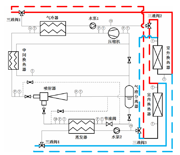 随着“碳达峰”和“碳中和”目标的提出,交通运输业电气化的目标进一步加快。其中电动汽车现在面临着由于低温采暖而造成的续航里程衰减严重和制冷剂选择等难题。团队基于标准汽车空调性能方面研究了不同运行参数对其性能的影响和CO2电动汽车空调的内在规律,根据电动汽车运行特点和跨临界制冷循环特性,团队对跨临界经典循环系统(TCRS)、带中间换热器的跨临界循环系统(TCRSI)、带中间换热器和喷射器的跨临界循环系统(TCRSIE)进行理论分析并做出比较,结果显示带中间换热器和喷射器的跨临界循环系统(TCRSIE)运行时,系统具有相同工况条件下的最优能效比COP。