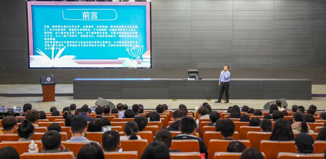 为加强师生海外安全风险防范意识,强化师生海外安全防护能力,11月9日,由天津市外办联合天津市教委、天津市公安局及我校共同举办的“安心出国境领保伴你行——天津市2023年领事保护宣传进校园专题活动”在现代教育中心报告厅成功举办。来自天津师范大学、天津工业大学、天津农学院及我校近200名师生参会。会前,我校校长白海力、副校长王中良亲切会见市外办来宾。