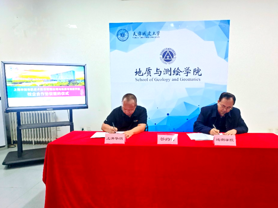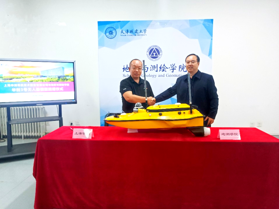 双方就校企合作、产教融合、师资培训、技术研发以及成果转化等方面展开深入讨论并达成合作意向。汪东川和胡炜代表双方共同签署了合作协议,上海华测导航技术股份有限公司向学院科普基地捐赠由该公司自主研发的无人船模型(APACHE 3)一台,用于国产新型测绘装备和技术的科普教育和宣传。