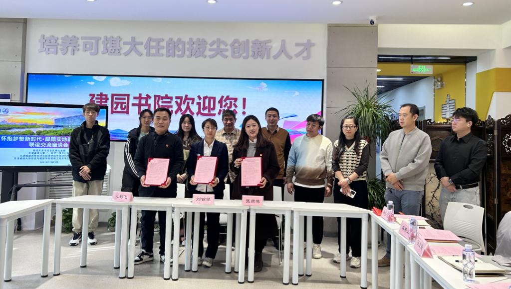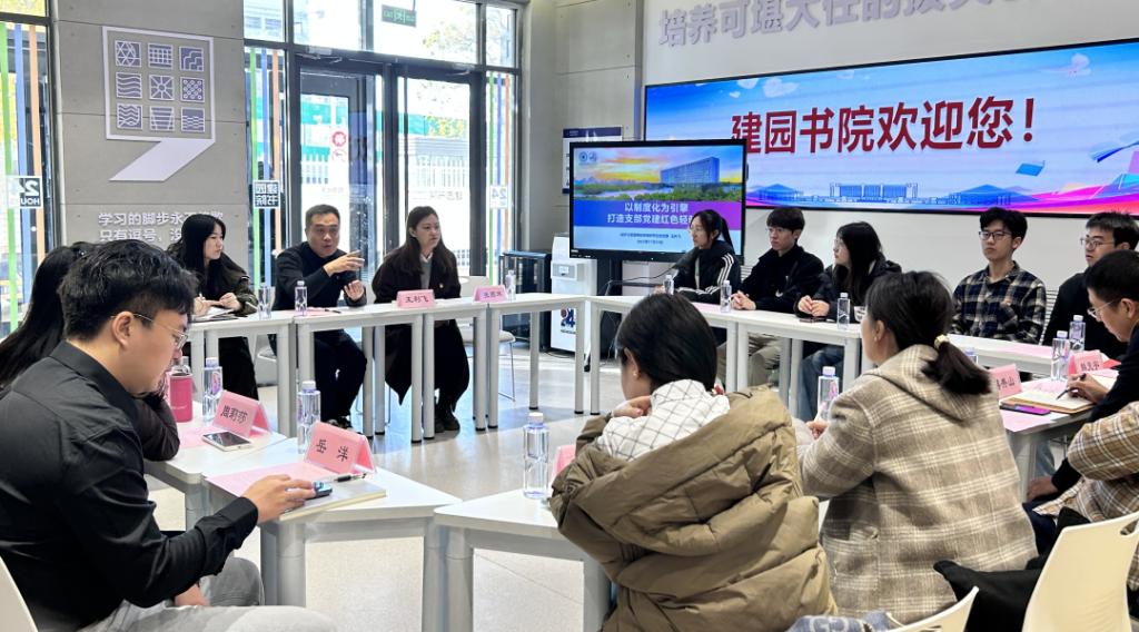 在建园书院座谈会上,民建河北区第七支部委员刘锦铭,经济与管理学院学硕研究生党支部书记王利飞、管理工程系学生第二党支部书记张燕琴分别就支部的组织建设、理论学习、特色工作、社会服务、科研成效等方面分享经验,碰撞思想火花。王利飞介绍了我校建园书院的建设情况。