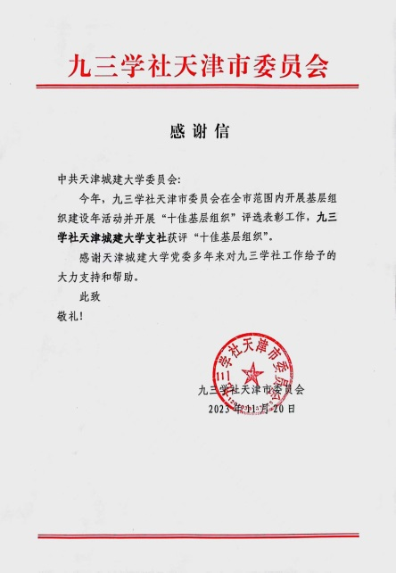 近日,在九三学社天津市委员会基层组织建设年活动总结表彰会上,我校九三支社获评九三学社天津市委员会“十佳基层组织”荣誉称号。九三学社市委会专门发来感谢信,对中共威客电竞委员会表示感谢。