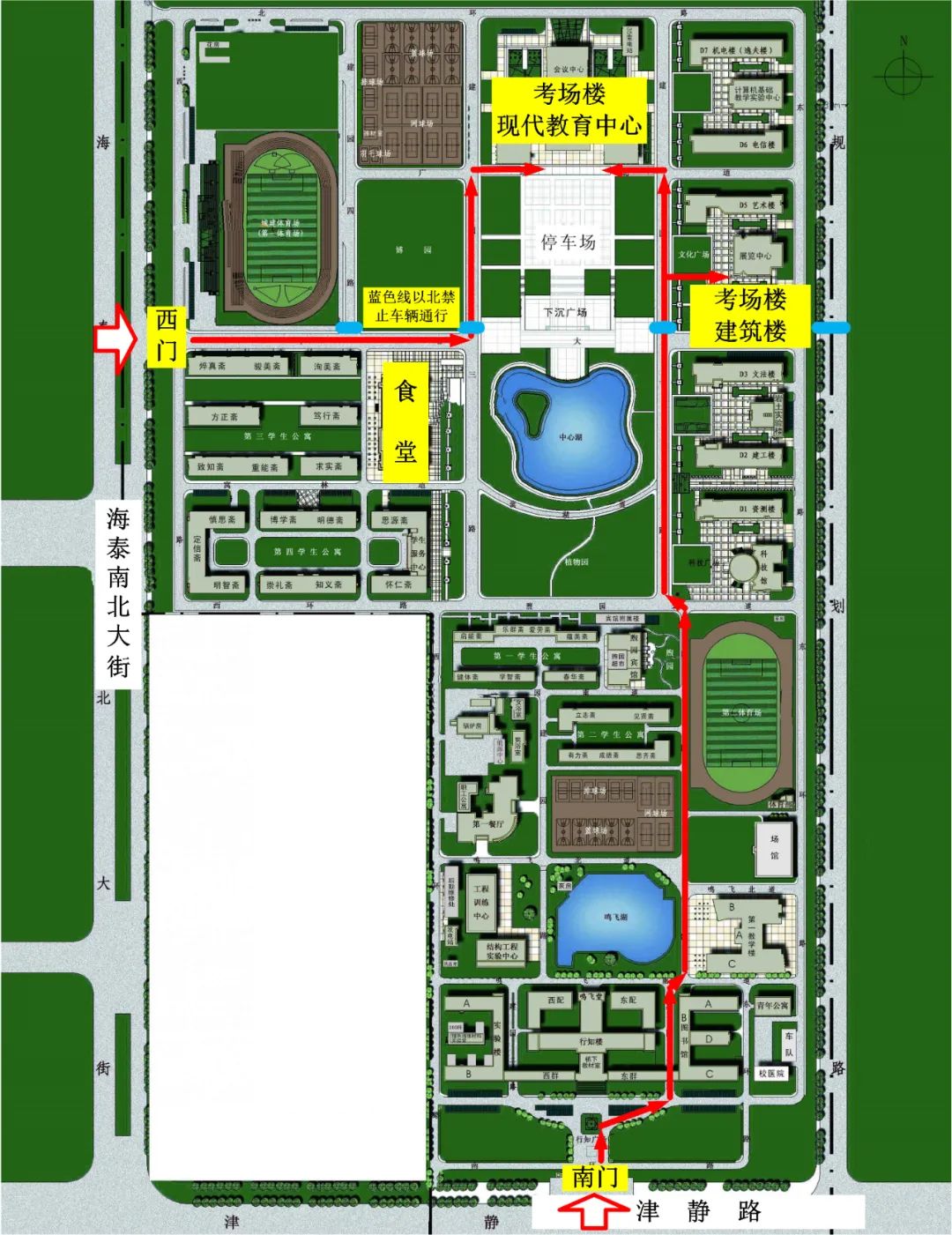 现代教育中心和建筑楼均位于后校区(如下图所示),考生可沿图中指示路线到达考试楼。外校考生车辆可进入校园中心大道(图中蓝色短线)以南区域停车。
