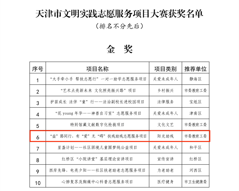 为深入贯彻落实党的二十大精神,落实全国宣传思想文化工作会议要求,聚焦推动我市高质量发展“十项行动”,推进文明实践志愿服务制度化常态化,市委宣传部、市文明办等26个部门联合开展的“学雷锋 做雷锋 共建天津志愿城”文明实践志愿服务项目大赛顺利举行。大赛共评选出10个金奖、30个银奖、60个铜奖,共计100个全市优秀文明实践志愿服务项目和14个优秀组织奖。我校推选的“益”路同行 有爱无“碍”扶残助残志愿服务项目荣获金奖。
