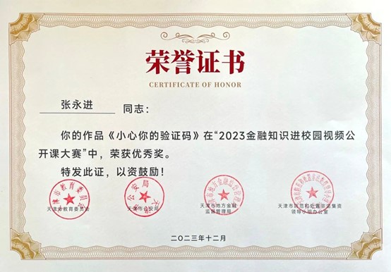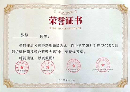 近日,市教育两委公布了2023年天津市教育系统国家安全重点课题调研获奖结果和天津市2023年金融知识进校园视频公开课大赛获奖结果。我校1项课题,5幅作品纷纷获奖,学校被评为2023年金融知识进校园视频公开课大赛优秀组织单位。