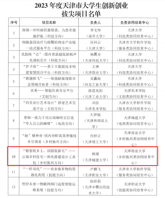 近日,天津市委教育工委、市教委公布了2023年度大学生创新创业拔尖项目立项名单,共立项15项。经过与全市高校同台竞技、激烈角逐,我校创新项目《“数智附乡土,田园筑新宅”——云端乡村住宅一体化搭建设计工具包(乡村振兴方向)》成功获批立项。