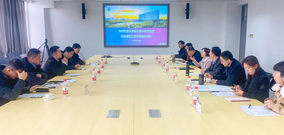 1月9日,天津泰达绿化科技集团股份有限公司常务副总经理曾威、天津泰达园林建设有限公司副总经理王磊、天津泰达园林规划设计院有限公司副总经理蒋新然、天津泰达盐碱地绿化研究中心有限公司首席专家张金龙、天津泰达绿化科技集团企业培训中心孙联军一行5人来我校国际工程学院开展调研、座谈。国际工程学院党总支书记杨萍、院长黄凌翔,党总支副书记孔伟,副院长李光旻、谭立峰,及学院相关工作人员参加座谈。会议由黄凌翔主持。
