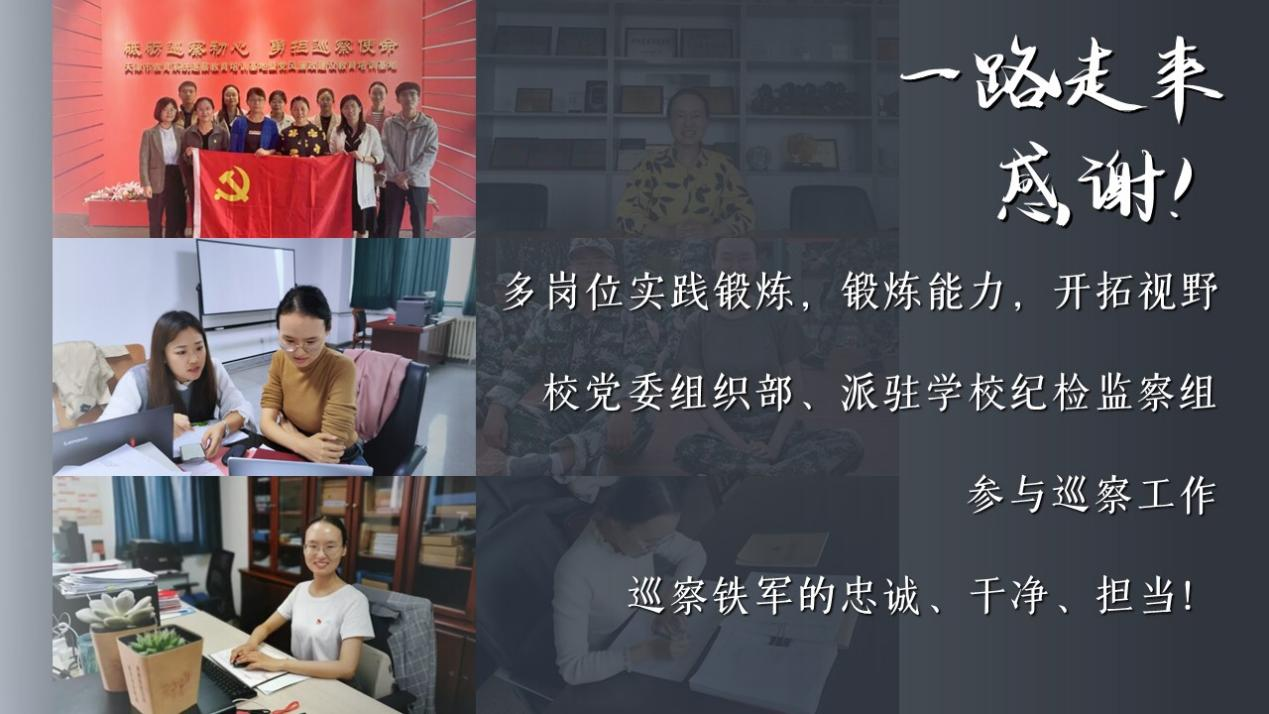 一路走来,她始终感谢学校提供的多岗位实践锻炼,让她能在党委组织部、派驻学校纪检监察组锻炼能力,开拓视野;参与学校巡察工作,让她明白巡察铁军的忠诚、干净、担当。