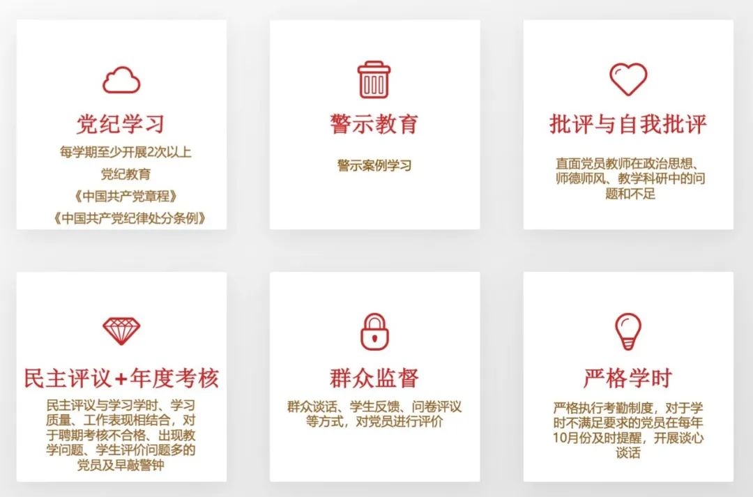 支部通过坚持党纪教育、强化警示教育、直面批评与自我批评、用好民主评议和年度考核、接受群众监督、严格学时要求6种方式监督党员,教育党员把纪律和规矩挺在前面,履行党员义务,遵守党规党纪。近年来连续获评校级“五好党支部”。