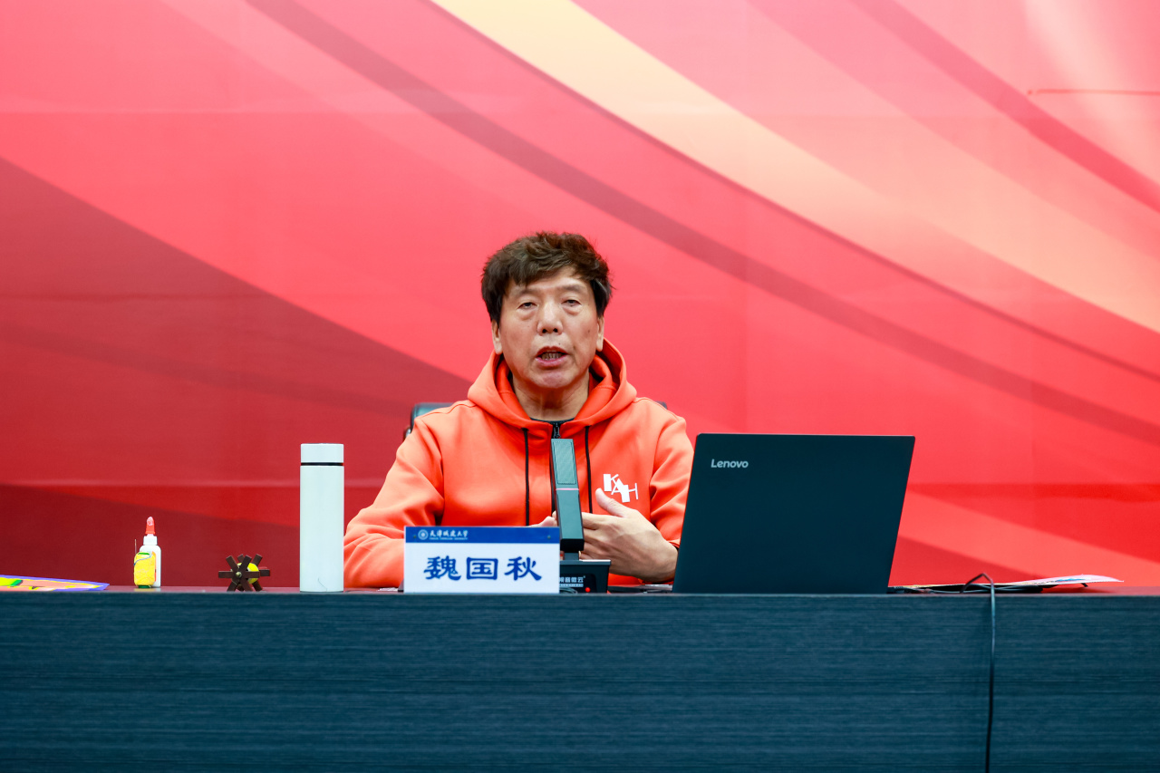 魏国秋详细回顾了“风筝魏”的历史发展脉络与历代创作大师的典型作品,剖析了“扎、糊、绘、放”风筝制作工艺的四大要点。并通过现场互动的方式,带领在场师生绘画、制作和放飞“太极风筝”。一个个颜色各异的风筝在报告厅上空盘旋,在场师生亲身体验“风筝魏”独特的艺术个性和复杂的制作工艺,更加深入的了解了天津本土文化的独特内涵,感受中华优秀传统文化的博大精深。