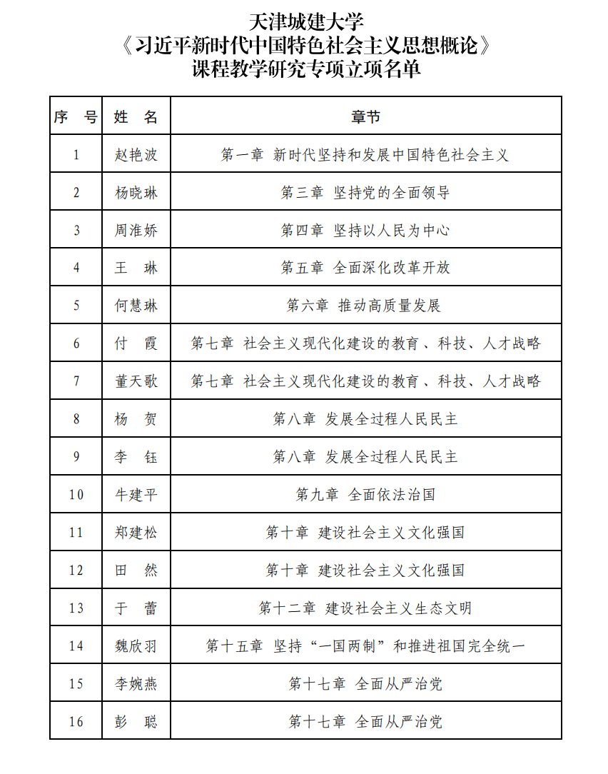 近日,2024年度天津市哲学社会科学规划项目《习近平新时代中国特色社会主义思想概论》课程教学研究专项名单公布,我校16项课题获批立项,立项数量位列全市第一,此次立项数量在学校思政课教学研究方面实现了新突破。
