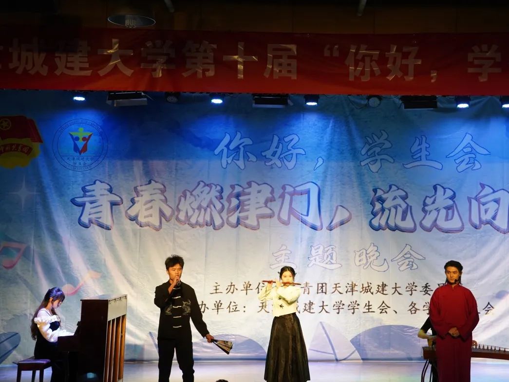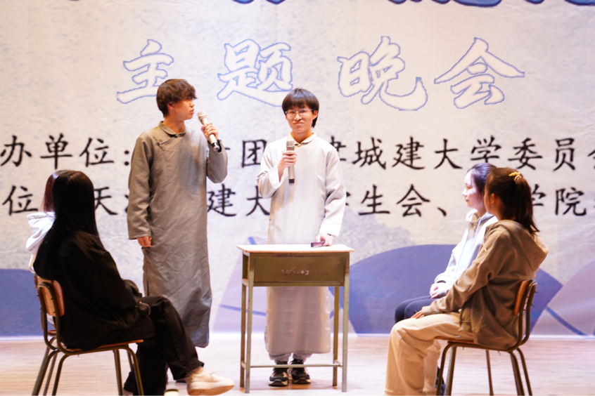 学生们通过情景剧、相声、京剧、手势舞、古筝、竹笛表演等多种艺术形式,演绎着弘扬优秀传统文化的底气,传递着激昂的青春力量。舞台剧《星火》故事情节新颖,以革命先辈与新时代青年的跨时空对话,展现了不同时代青年的家国情怀。《津门流年,青春之光》围绕爱国、敬业、诚信、友善四个主题展开故事,通过生动的演绎展现优秀传统文化的魅力和同学们乐观向上的奋斗精神。《仰望星空》用较为轻松的氛围寓教于乐,呼吁同学们要传承雷锋精神、为同学服务。《似水年华》以京剧形式开场,用优美的唱段展示了津门特色,“怕流水年华春去渺”,体现出青春的热烈和对时间流逝的感叹。另有《绽放》《筑梦青春》等精彩节目纷纷上演,活动在大合唱中推向高潮,歌声嘹亮,情怀真切,配合朝气蓬勃的舞姿,展现了天城大学子的青春风采。