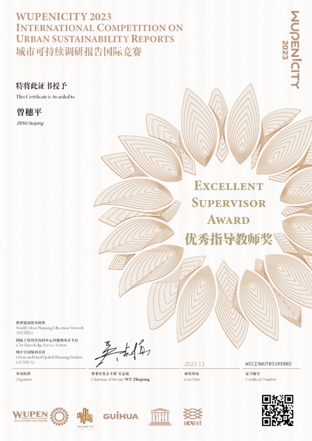 贺信指出,本届国际竞赛组委会共收到符合参赛要求的投稿作品1624份(其中,城市设计学生作业国际竞赛913份,城市可持续调研报告国际竞赛711份),经过两轮专家评审,最终确定获奖名单。我校学生获一、二和三等奖共计6份;威客电竞荣获优秀组织奖,曾穗平、杨佳璇老师荣获优秀指导教师奖。