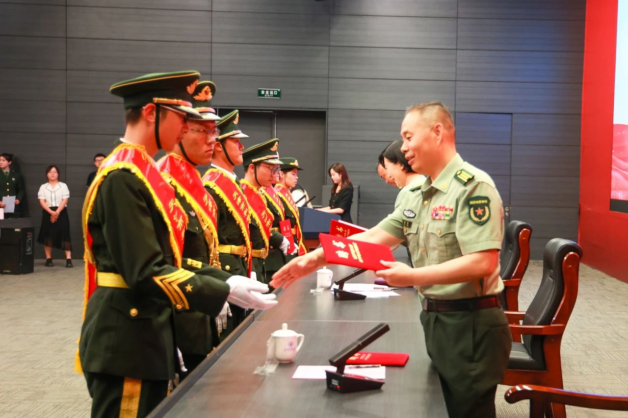 在“天津市和平区征兵宣传形象大使”聘任仪式上,主席台领导向国旗护卫队和退役士兵代表颁发聘书。