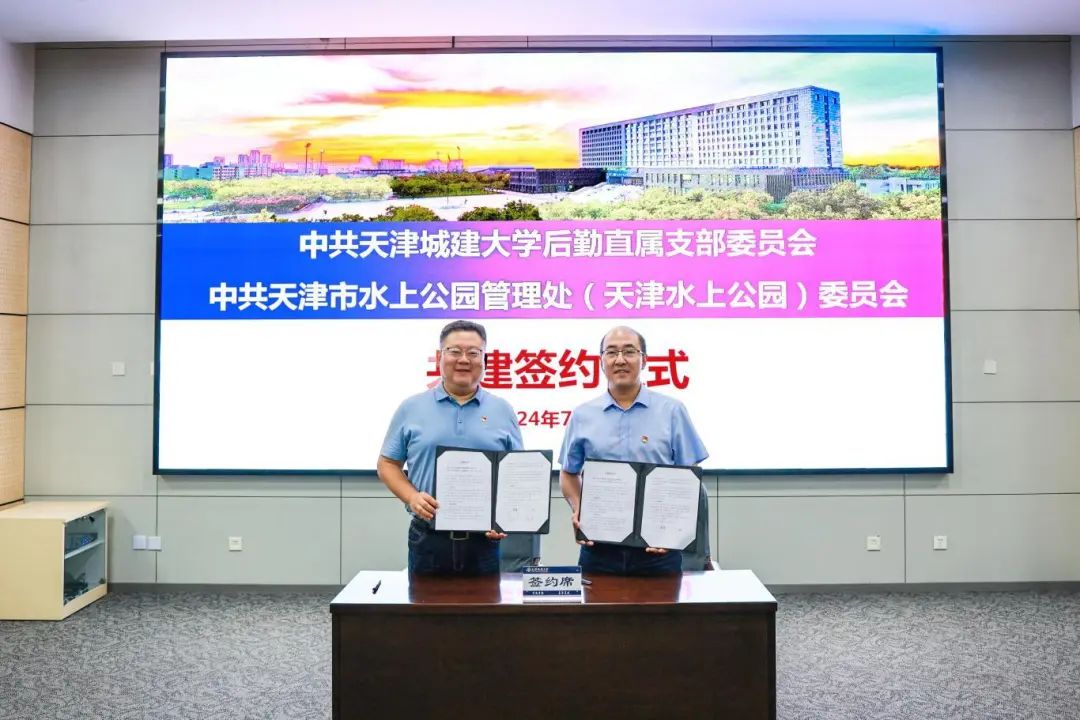 共建仪式上,我校后勤处处长、后勤直属党支部书记(兼)贾凤勇水上公园党委副书记、园长贾非共同签订了共建协议。双方就加强党组织的联系协作,共同探索生态校园建设新途径以及服务美丽天津建设等内容开展深入交流。