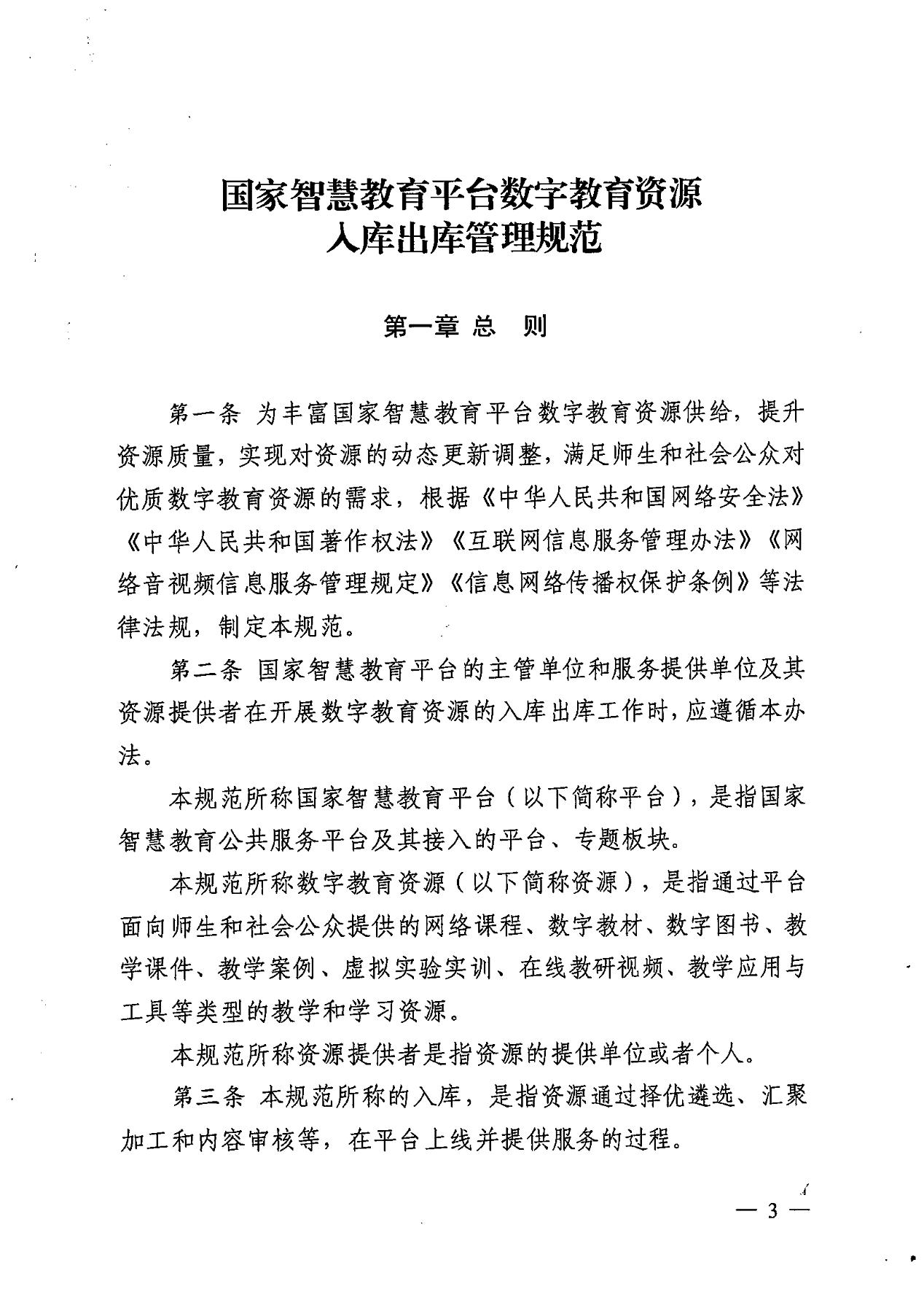 近日,为加快推进国家教育数字化战略行动,保障数字教育资源入库出库,教育部办公厅印发《国家智慧教育平台数字教育资源入库出库管理规范》(简称《规范》)。
