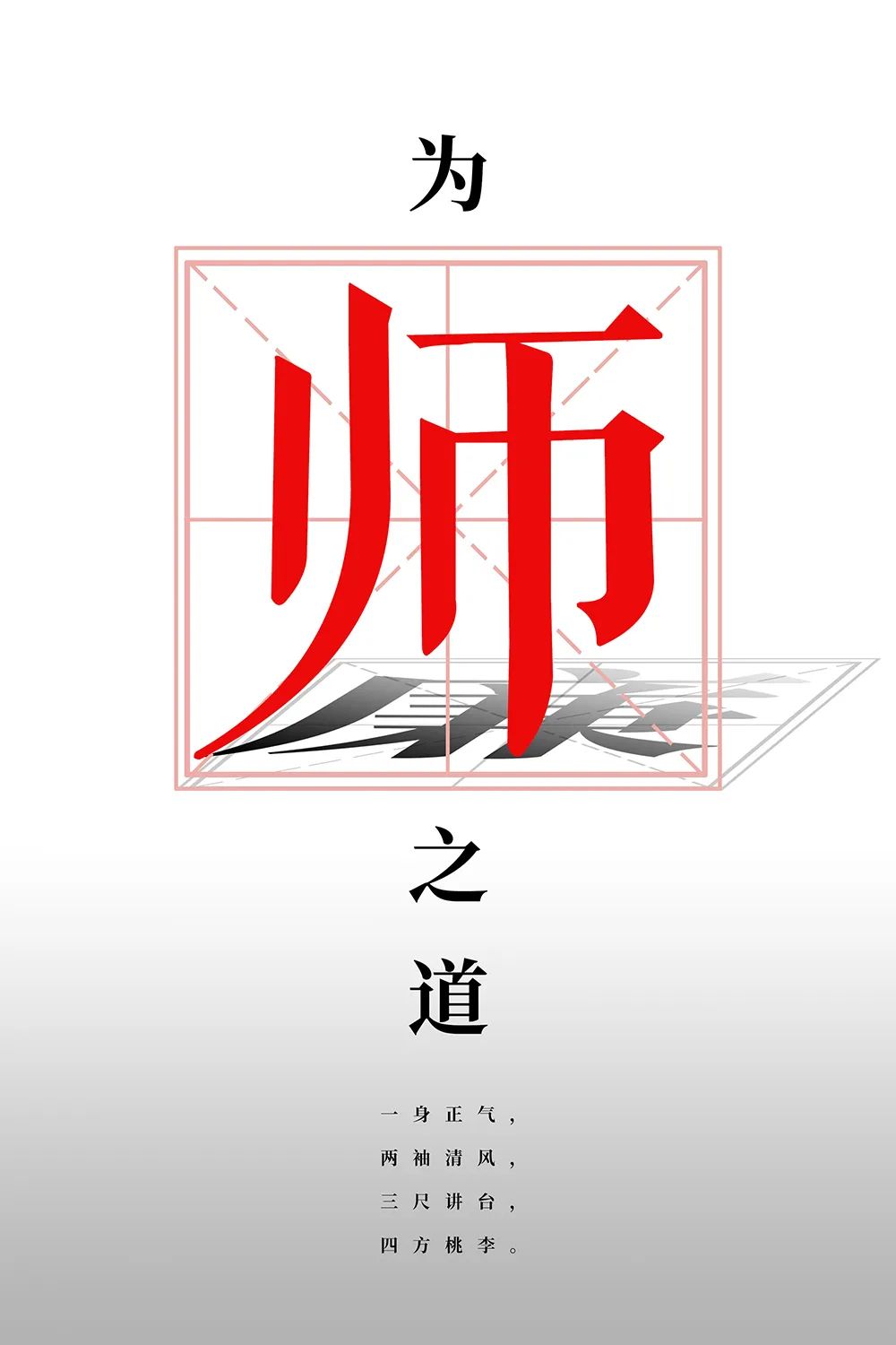 汉字是中华传统文化的核心,它凝聚了中华民族最核心的力量,本设计作品将汉字“师”字作为主形象,并巧妙的将“师”字的影子和“廉”字结合,不仅体现了教师要廉洁从教,要用真爱去关心学生,公平、公正地对待每一位学生。更体现了身教重于言教,孔子曰:“其身正,不令则行;其身不正,虽令不从。” 教师,是学生学习和效仿的榜样和楷模,这也是本作品的核心理念,“师”正影子“廉”。
