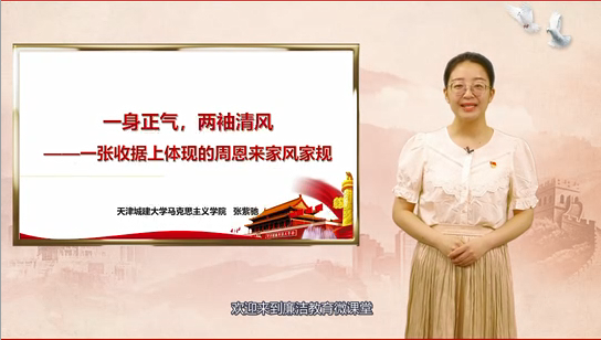 该作品围绕习近平总书记在纪念周恩来同志诞辰120周年座谈会上讲话中与廉洁主题相关的内容,通过介绍陈列在周恩来邓颖超纪念馆的一张收据,引申出周恩来廉洁的十条家规,并讲述“十条家规”背后生动、形象、感人的故事,从而教育引导干部师生继承并弘扬红色家风,使红色家风代代相传。以学生为中心,充分运用天津红色资源,通过小切口讲述大道理,通过小故事展现大主题,从而使廉洁教育达到润物无声的效果。