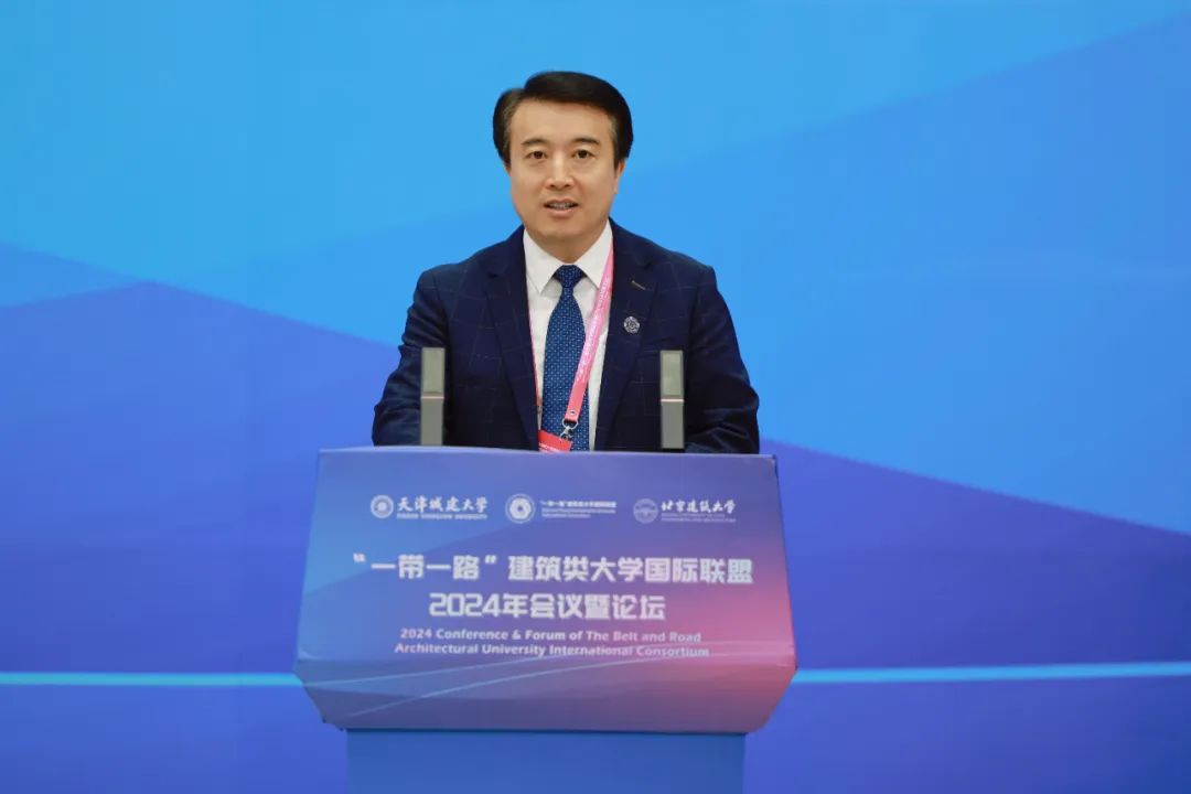 19日上午,“一带一路”建筑类大学国际联盟2024年会议在我校现代教育中心报告厅举办。天津市人民政府外事办公室党组成员、对外友好协会副会长黄春艳,北京建筑大学党委书记郑宇,山东建筑大学校长于德湖,哈萨克斯坦建筑与土木工程学院校长Margarita Imandossova、乌兹别克斯坦撒马尔罕国立建筑与土木工程大学校长Canbay Turkyilmaz Cigdem,波黑莫斯塔尔大学校长Zoran Tomić,北京建筑大学副校长陈红兵、杨建伟,安徽建筑大学副校长李早,长春建筑学院副校长李琦,河北建筑工程学院副校长姚冰,河南城建学院副校长孙玉周,西安建筑科技大学副校长雷鹏,中国丝路集团有限公司董事长闫立金,北京国际和平文化基金会秘书长王红专,中交一公局集团有限公司党委副书记、工会主席宋猛,广联达科技股份有限公司助理总裁、教育事业部副总经理李忠宝,马来西亚拉曼大学副校长Goi Bok Min,埃塞俄比亚亚的斯亚贝巴科技大学副校长Abraham Debebe Woldeyohannes,哈萨克斯坦建筑与土木工程学院副校长Bakhtiyar Sabdenaliyev以及来自北京工业大学、河北工程技术大学、内蒙古建筑职业技术学院、南昌大学、东北大学、苏州科技大学、北京科技大学、希腊塞萨洛尼基亚里士多德大学、俄罗斯秋明工业大学、印度尼西亚泗水理工大学、俄罗斯建筑土木科学院、日本北九州市立大学、保加利亚土木建筑及大地测量大学、波黑巴尼亚卢卡大学、塞尔维亚诺维萨德大学、英国南威尔士大学等中外联盟成员单位嘉宾代表出席会议。我校党委书记史庆伟、校长王中良,校党委常委、副校长陈志华、杨静,机关干部及师生代表等600余人参加会议。王中良作为2024年联盟会议暨论坛执行主席主持会议。