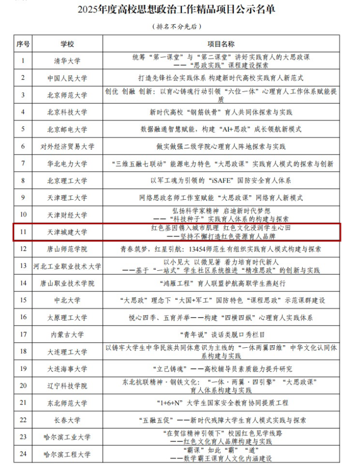 近日,教育部公布了2025年度高校思想政治工作质量提升综合改革与精品建设项目遴选结果的公示名单,我校4个项目入选,继续在市属高校名列前茅。其中,《红色基因镌入城市肌理红色文化浸润学生心田——坚持不懈打造红色资源育人品牌》入选高校思想政治工作精品项目(全国100项,天津3项);《天津红色教育建筑遗产数字化保护传承》入选高校数字文物开发项目(全国20项,天津1项);《基于“共生共建共享”理念的“人民城市”高校大思政课特色品牌创建》入选新时代伟大变革融入高校思想政治教育典型案例(全国100项,天津4项);入选全国高校示范“一站式”学生社区(全国100所,天津4所)。本次入选项目数取得了新的突破,学校将以此为契机,积极建设具有标杆作用、示范效应、广泛影响力和持续发展力的优秀思政工作实践和典型模式。
