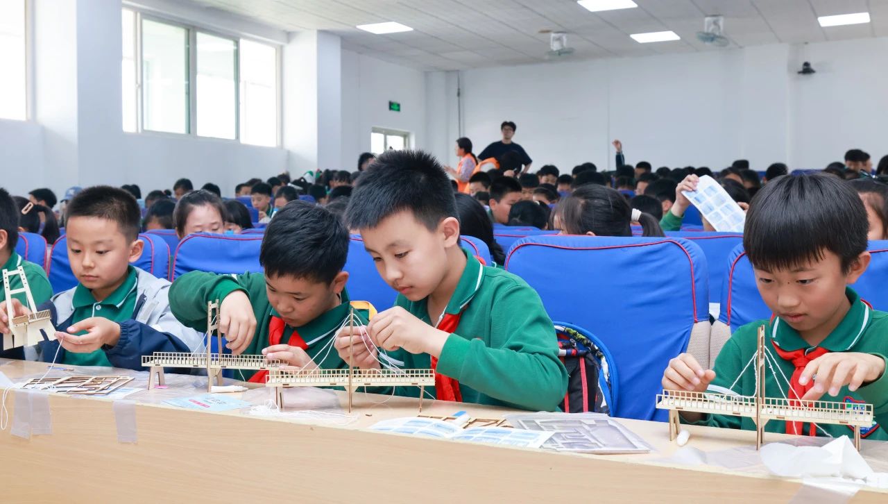 报告结束后,孩子们化身“桥梁设计师”,分组拼装斜拉桥模型。从图纸解读到构件组装,他们时而蹙眉争论,时而击掌庆贺。短短半小时,一座座精巧的斜拉桥在课桌上“拔地而起”,孩子们眼中闪烁着对未来的憧憬。