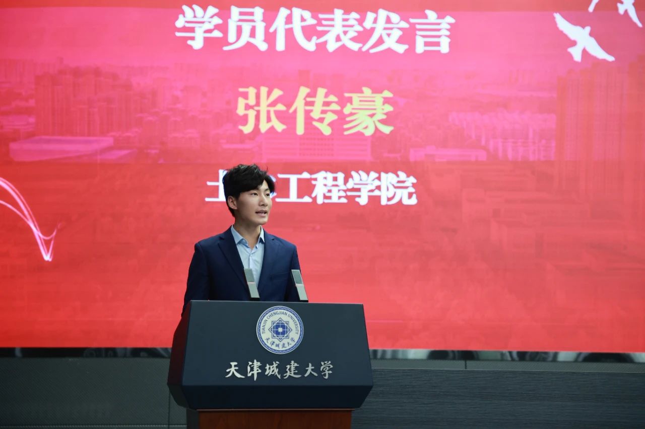 土木工程学院张传豪代表全体党校培训班学员发言,表示将以一名优秀共产党员的标准严格要求自己,深学细悟习近平新时代中国特色社会主义思想,在理论溯源、实践对照中筑牢信仰之基,彰显先锋力量。