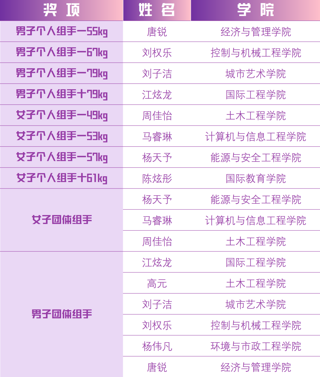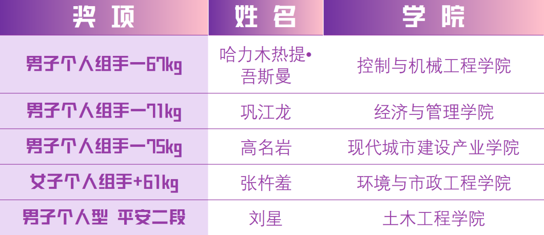 本次比赛,我校共派出34名运动员参赛,健儿们经过顽强拼搏,斩获10金、5银、7铜团体总分第一名的优异成绩,充分彰显了“重德重能 善学善建”的校训精神,展现了我校开展新时代体育建设和推动体教融合的重要成果,体现了天城大学子昂扬向上的青春风貌。