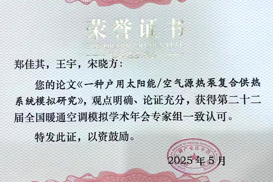 研究生郑佳其在“建筑能源系统与可再生能源模拟”分论坛作了题为“《一种户用太阳能/空气源热泵复合供热系统模拟研究》”的专题报告,报告针对北方农村清洁供暖需求,设计了一种太阳能/空气源热泵复合供热系统,提出了一种并联集成方案及温度控制策略,研究了系统在京津冀的推广潜力和节能环保效益。报告获得专家一致认可,被评为优秀论文。