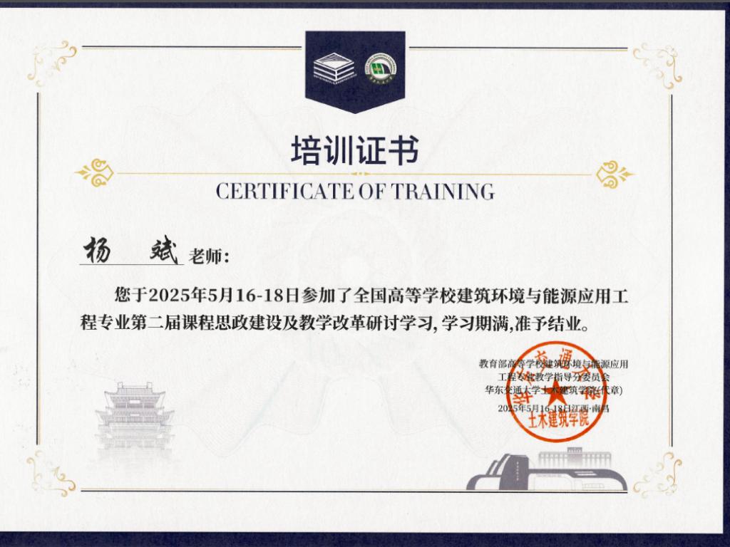 近日,由教育部高等学校建筑环境与能源应用工程专业教学指导分委员会主办,华东交通大学土木建筑学院和基础设施智慧建造及运行保障现代产业学院承办的全国高等学校建筑环境与能源应用工程专业第二届课程思政建设及教学改革研讨会在江西省南昌市召开,我校能源与安全工程学院院长杨斌教授,副院长曹为学副教授参加会议。