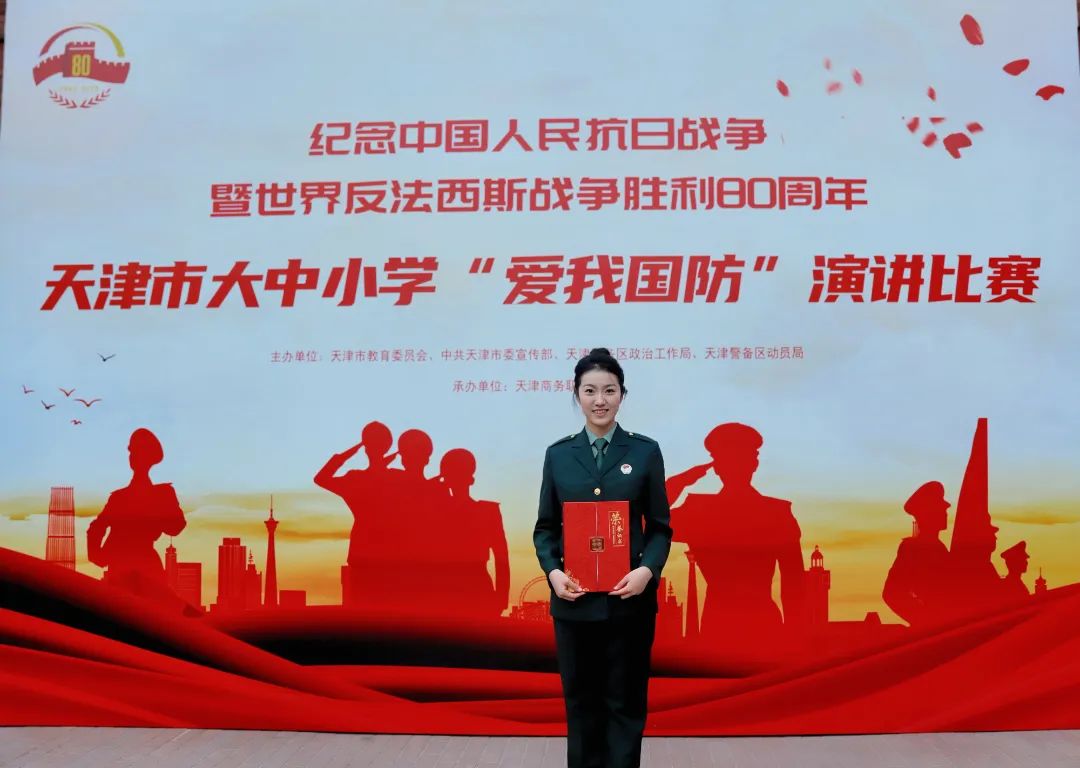 近日,由天津市教育委员会、中共天津市委宣传部、天津警备区政治工作局、天津警备区动员局主办的纪念中国人民抗日战争暨世界反法西斯战争胜利80周年天津市大中小学“爱我国防”演讲比赛总决赛落下帷幕。我校国际工程学院退役女兵石静蕾表现优异,荣获大赛三等奖。