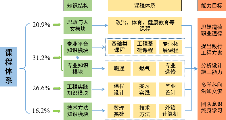 掌握暖通空调公共设施系统的基本理论和基本知识,接受能源系统的供给和应用及建筑环境的工程设计、设备开发与使用、施工组织与安装、系统运行调试等方面的基本训练,开展相关领域技术和服务工作,具有多学科背景下沟通及跨文化条件下交流能力,适应不同环境和机会赋予的工作任务,获得可持续性职业发展和社会价值。细分为12个毕业要求,拟提升和掌握如下12方面能力:1、工程知识,2、问题分析,3、设计/开发解决方案,4、研究,5、使用现代工具,6、工程与社会,7、环境和可持续发展,8、职业规范,9、个人和团队,10、沟通,11、项目管理,12、终身学习。