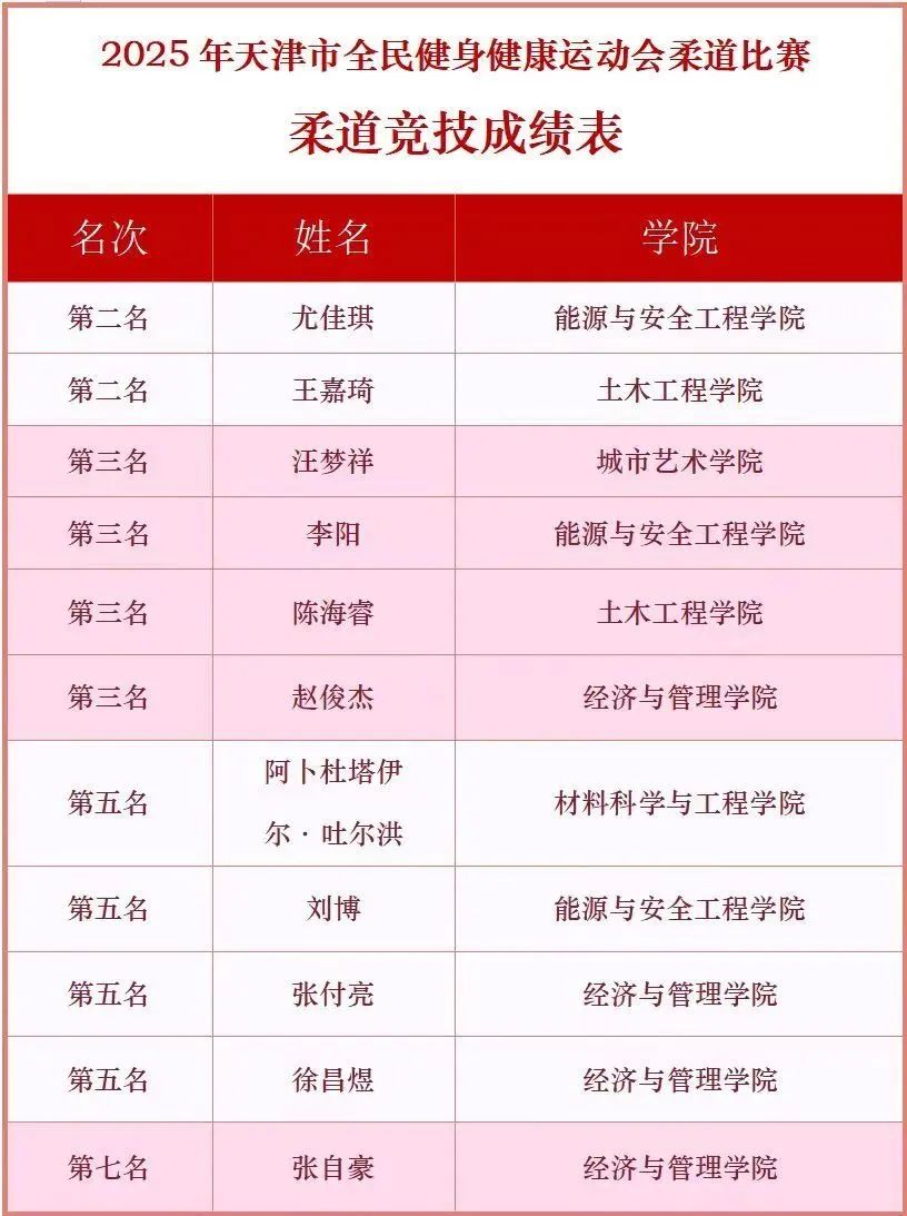 在天津市“体彩杯”全民健身健康运动会柔道比赛的赛场上,我校14名队员同样展现了顽强的拼搏精神。面对来自全市20余支代表队的500余名运动员,我校健儿沉着应战,最终勇夺2枚银牌、4枚铜牌、4个第五名和1个第七名的佳绩。